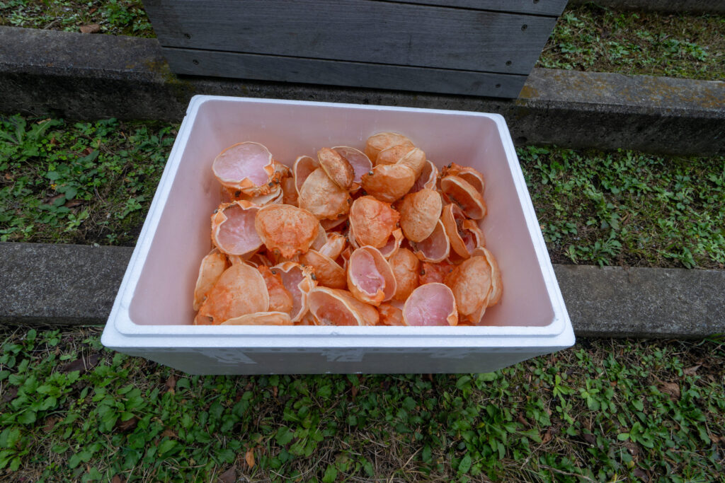 こちらは本物のズワイガニの甲羅。静岡県沼津市ではタカアシガニの甲羅に鬼の絵などを描いて魔よけや厄病除けとして各家庭の玄関に飾っていたようです。このタカアシガニのお面からインスピレーションを得て行ったのが「ズワイガニのお面」のワークショップでした。