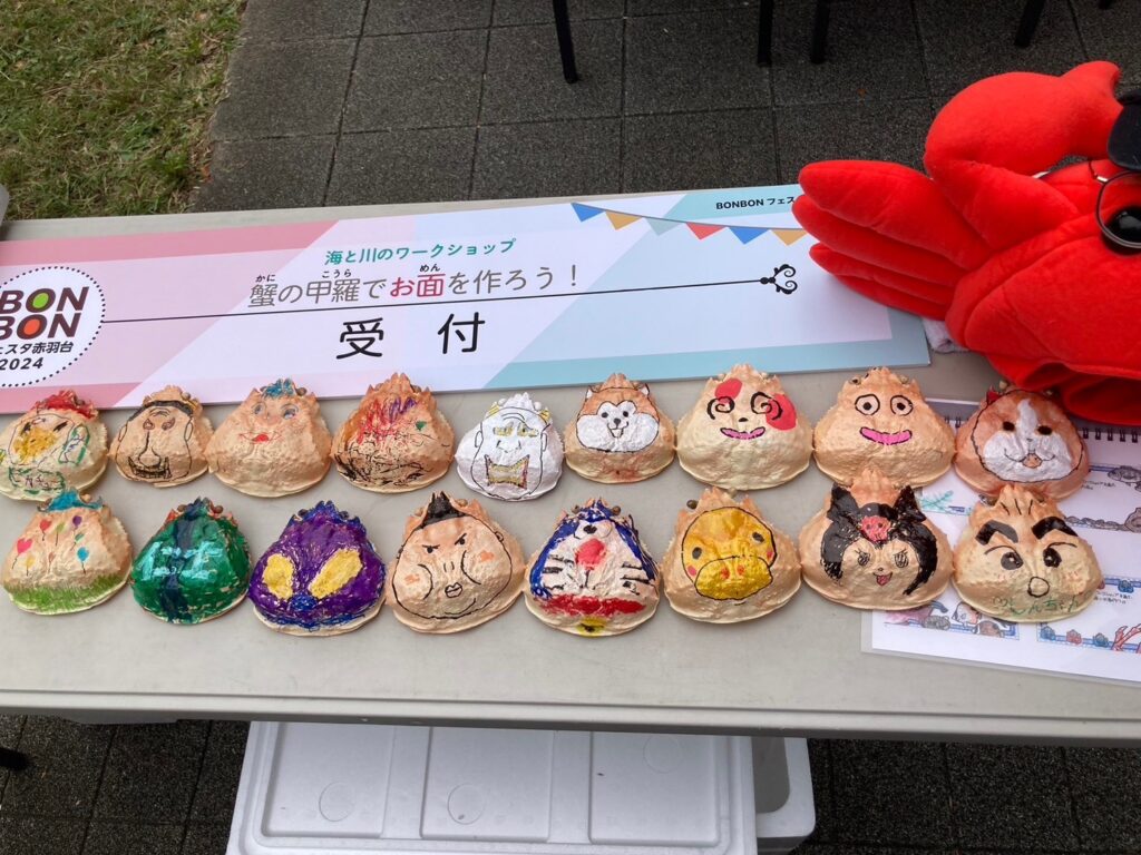 同時にタッチプールと、ズワイガニの甲羅(本物)にイラストを描いてミニお面を作るワークショップも開催しました。