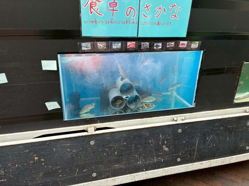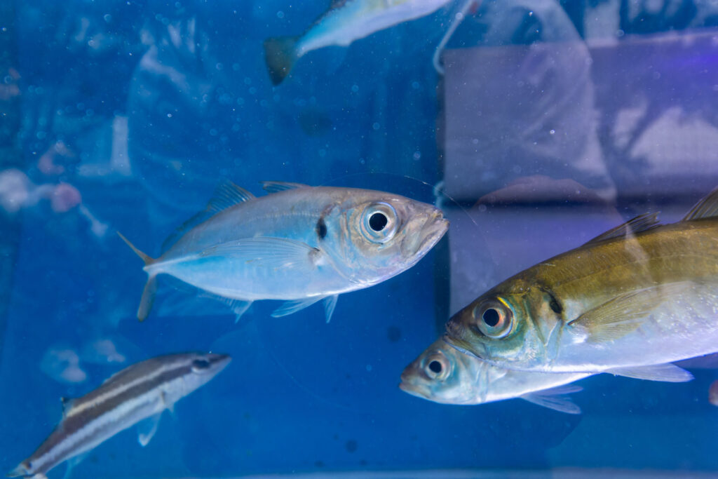 東京湾は、江戸前寿司の魚が捕れる豊かな漁場でもあります。マアジスズキなど、食卓に並ぶ魚がたくさん生息しています。赤羽団地移動水族館と同じく、水流装置を設置して水槽内に波を起こし、東京湾の沖の環境を再現しました。