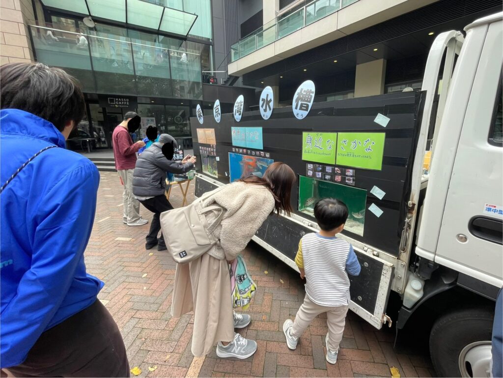 2tトラックの荷台に水槽をそのまま乗せ、水槽を会場まで運ぶ形で展示を行いました。前回の赤羽移動水族館同様、今回も「東京湾」をテーマとし、3つの水槽「身近なさかな」「食卓のさかな」「カラフルなさかな」を展示しました。親子向けによりわかりやすく、見やすい展示に仕上げました。