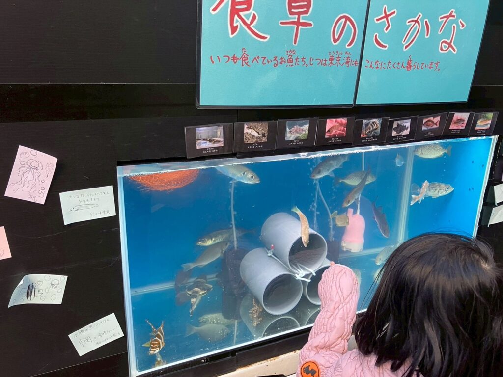 スズキの後ろにあるオレンジ色の漁網も本展示のポイントです。展示を見るお客様が難しいパネルを読まずとも、視覚的に一発で「東京湾の漁場の雰囲気」を理解できる工夫です。お客様からも直接、「東京湾にはこんな魚がいるんだな」「よく食べる魚も東京にいるんだね」という感想をいただきました。