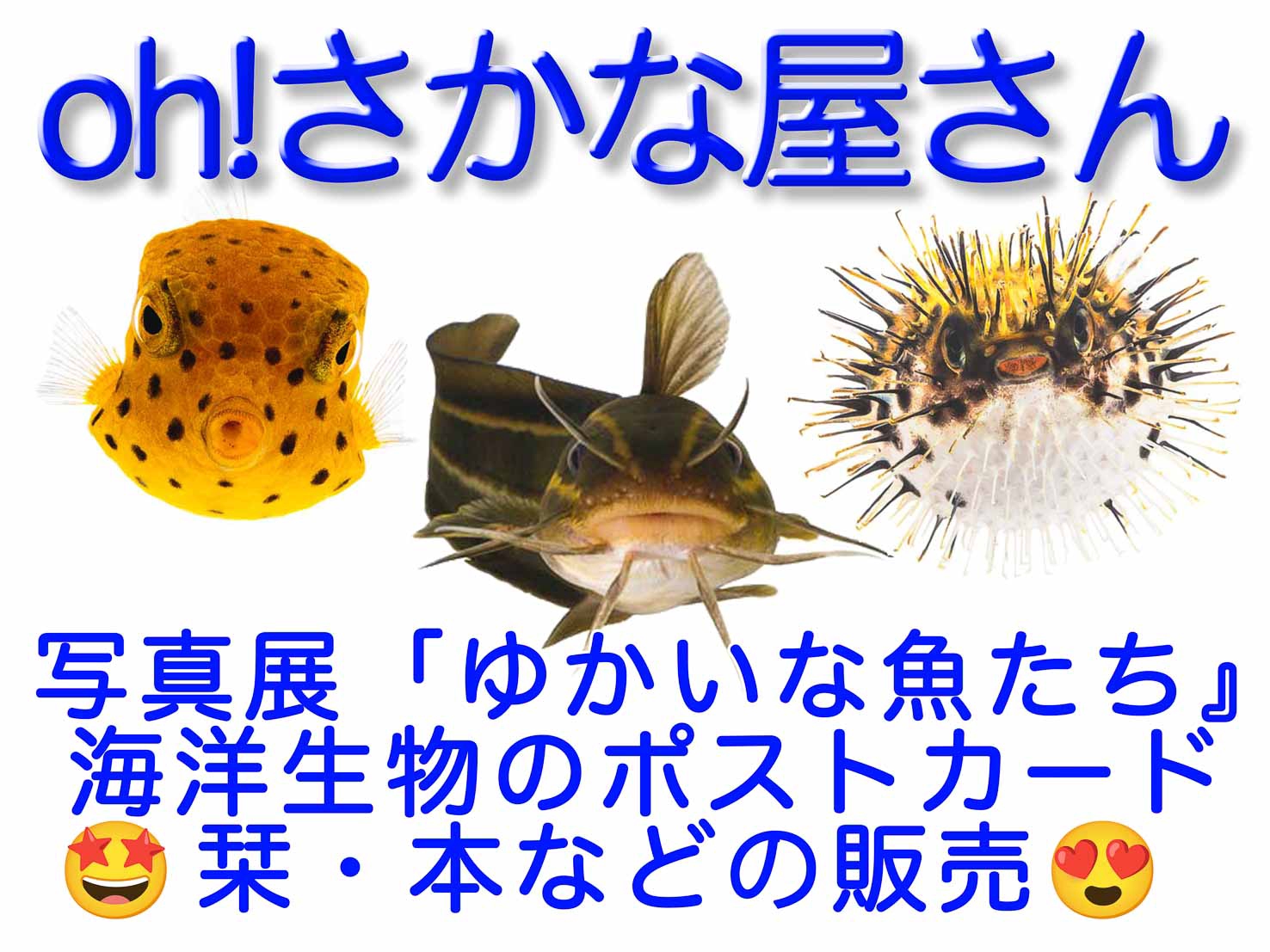 oh!さかな屋さん海洋生物の素晴らしさを伝えます。写真展&物販。【通常商品】★出版本:はじめての魚類学・ゆかいな魚たち 2,800円★フォトブック:魚面・蟹面 1,000円★ポストカード(talkin